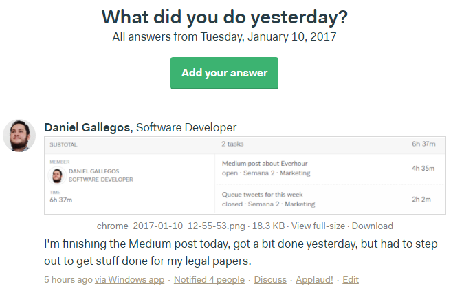With Hubstaff, we had to switch to another application and wait for all of our Basecamp 3 tasks to sync with their API to begin working. This happened often. With Everhour, we’re able to get start working right when we assign/we’re assigned tasks.