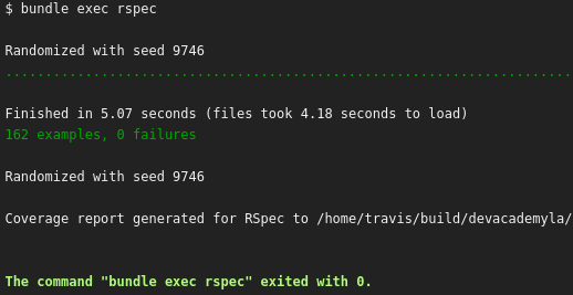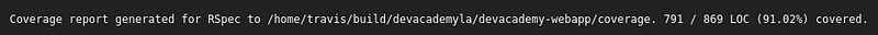 We also have Simplecov to check our code coverage, which runs right alongside our RSpec tests. That means that when we run a build, we also get a percentage of how much code we’re actually testing.