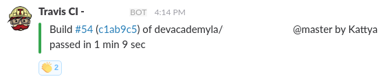 This helps us know the state of all of our projects without having to leave Slack, and lets us know our personal progress. Since all the build logs are shared in our team, we can help each other out, too!