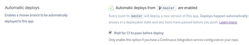 One thing to note is the “Wait for CI to pass before deploy” option. This makes sure that our production app always has working tests and is always up to standard, because it checks that our CD build passed.