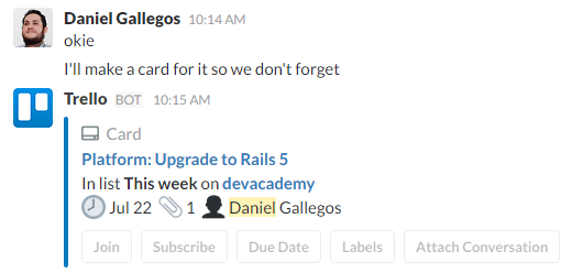 You say you’re going to make a card on Trello to remind yourself to upgrade the platform to Rails 5? There’s a Slack app for that.