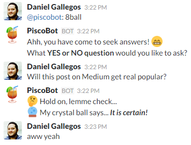 We’re are currently working on rewriting a bot I made for our Slack team here at devAcademy called PiscoBot. Creating an accessible user interface through chat sounds hard, but it’s actually pretty easy (and definitely worth it).