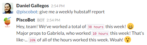 For example, we have a command in PiscoBot allow us to check who’s worked the most on Hubstaff. It’s a conversation starter! Your can use bot replies as an icebreaker to talk about any topic you want. We use it to discuss how many hours our team is working and how we can coordinate our working hours better.